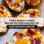 These Twice-Baked Loaded Breakfast Potatoes make for a hearty and satisfying way to start your day. Crispy russet potato shells are filled with creamy mashed potatoes, smoky beef bacon, melty cheddar, and a perfectly baked egg. Whether for a weekend brunch or meal prep, this naturally gluten-free dish is full of comforting flavors.