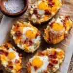 Keywords: twice baked potatoes, breakfast potatoes, loaded potatoes, gluten free breakfast, cheesy breakfast, hearty breakfast, baked eggs in potatoes