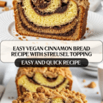 This Vegan Cinnamon Bread is a moist and flavorful quick bread featuring a cinnamon sugar swirl and optional streusel topping. Perfect for breakfast or a cozy snack, it’s dairy-free, egg-free, and easy to make using simple pantry ingredients. The bread combines a tender crumb with a sweet cinnamon center, ideal for serving with vegan butter or enjoying toasted.