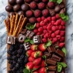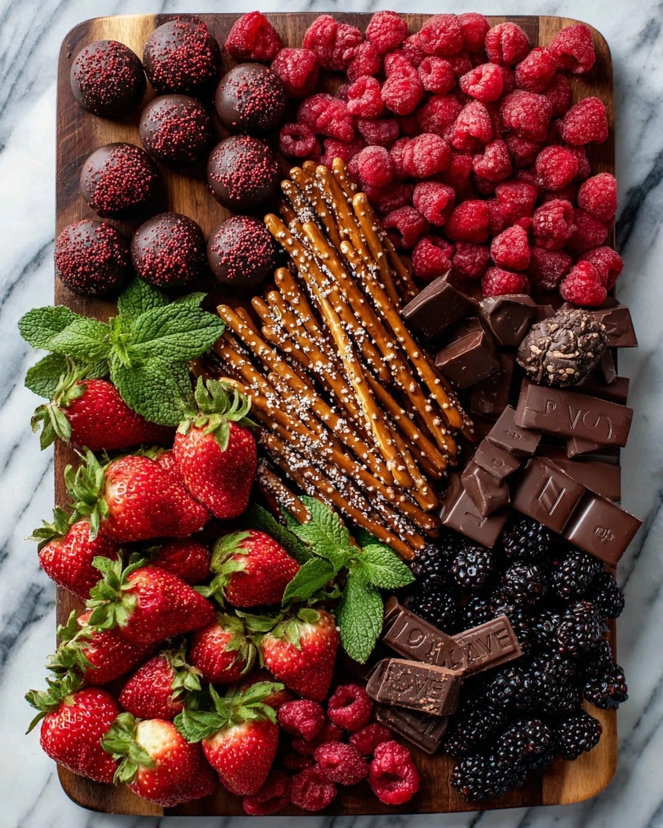You can prepare the chocolate-covered strawberries, pretzels, and truffles up to 2 days ahead. Keep them refrigerated and assemble the board just before serving for the freshest presentation.