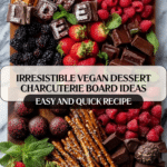 Create an elegant and delicious dessert charcuterie board featuring vegan chocolate-covered strawberries and pretzel rods, fudgy no-bake brownie truffles, fresh fruits, and a variety of sweet and savory snacks. This recipe combines easy-to-make components and beautiful presentation, perfect for entertaining or indulging in a luxurious treat.