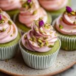 - Decorate: Sprinkle the tops of the frosted cupcakes with the chopped pistachios. Optionally, garnish each cupcake with a mini dried rose bud for an elegant finish.