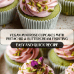 These Vegan Mini Rose Cupcakes are delightful bite-sized treats featuring a tender, pistachio-studded green cupcake base topped with a smooth, pastel pink rose-flavored vegan buttercream. Perfectly balanced with hints of lemon and rose water, these cupcakes combine elegance and vegan-friendly ingredients in a visually stunning, delicious dessert ideal for parties or special occasions.