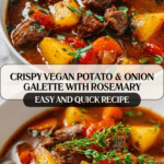 This vegan potato and onion galette is a rustic, savory tart featuring a flaky spelt flour crust filled with sweet caramelized onions, thinly sliced potatoes, and creamy vegan feta cheese. Enhanced with fresh rosemary and Everything Bagel seasoning, this dish offers a perfect balance of flavors and textures, making it an impressive yet simple option for a cozy meal or elegant appetizer.