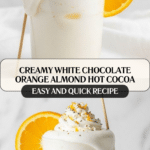 This decadent White Chocolate Orange Almond Cocoa is a luxurious winter drink combining smooth white chocolate ganache infused with zesty orange, nutty almond paste, and a hint of warm cinnamon. Made with a creamy orange-infused white chocolate ganache base, this comforting hot chocolate is enhanced with oat milk and garnished with whipped cream and fresh orange for a refined twist on a classic cozy beverage.