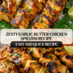 Zesty Chicken Spiedini with Garlic Butter Bliss is a flavorful Italian-inspired grilled chicken dish featuring tender chicken bites marinated in a tangy mixture of olive oil, white wine, and lemon juice, then coated in Italian-seasoned breadcrumbs and grilled to crispy perfection. This dish is finished with a sumptuous garlic butter sauce infused with fresh parsley and extra lemon juice, creating a perfect balance of zesty and buttery flavors that make it ideal for a delightful weeknight dinner or a weekend gathering.